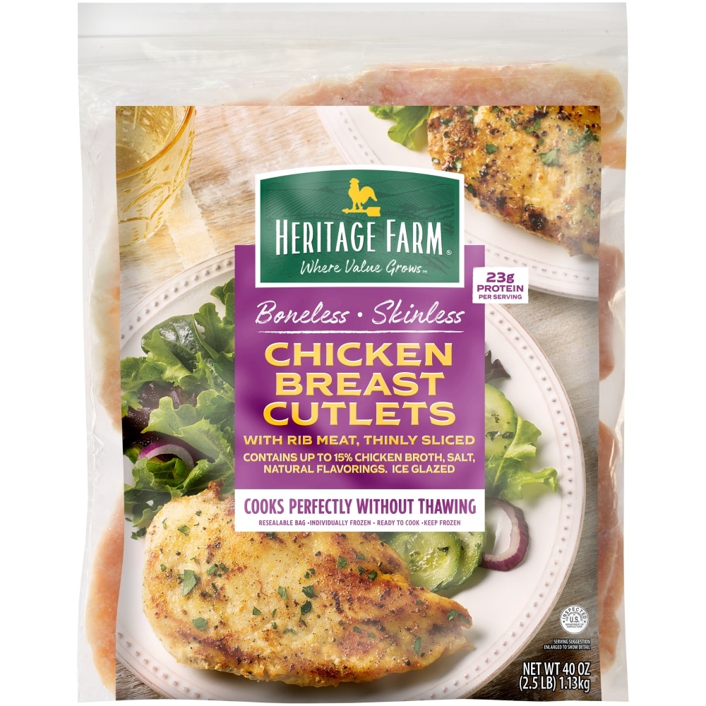 Heritage Farm® Frozen Raw Boneless Skinless Chicken Breast Cutlets make mealtime easy. Thinly sliced and tender, they're a good choice for quick, tasty dinners. These easy-to-prepare cutlets contain 2…