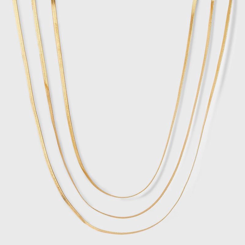 Accessorize your look day or night with this Three-Row Herringbone Necklace from A New Day™. This multistrand, three-row necklace features a timeless herringbone design in a gold finish for a luxe sty…