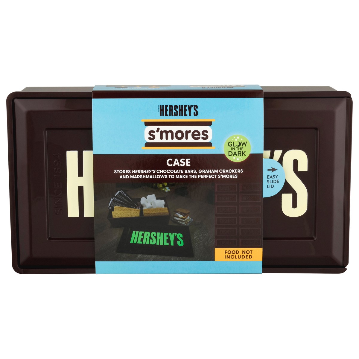 Glow in the dark. Stores Hershey’s chocolate bars, graham crackers and marshmallows to make the perfect S'mores. Hershey's chocolate bars. Marshmallows. Graham crackers. Easy slide out lid. Use s'more…