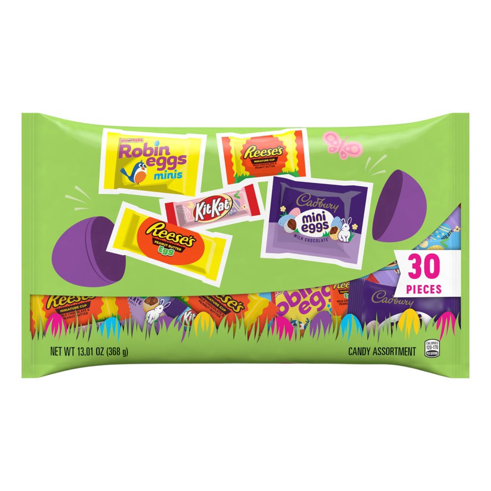 Reese's peanut butter cup miniatures; whoppers robin eggs minis; cadbury milk chocolate mini eggs: careful: small candy can be a choking hazard. use caution when eating.