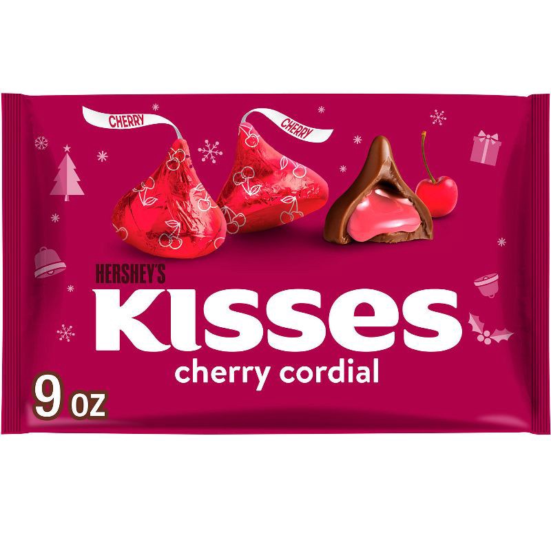 - Contains one (1) 9-ounce bag of HERSHEY'S KISSES Cherry Cordial Milk Chocolate Filled with Cherry Cordial Creme Candy