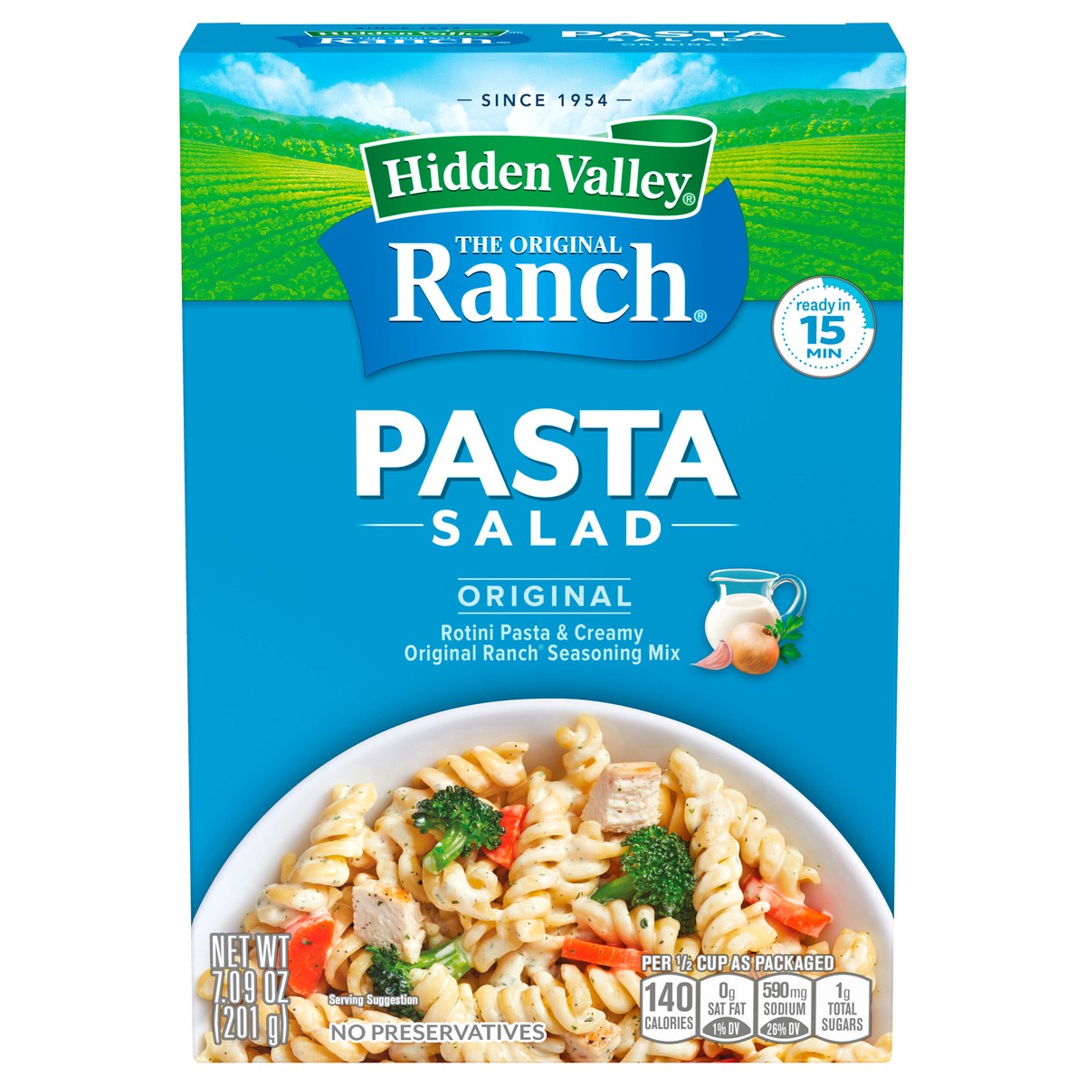 Hidden Valley Pasta Salad, Original Ranch, helps you make a tasty side dish in minutes. Just mix the seasoning packet with milk and mayonnaise, and then toss with cooked pasta and you''re done. Add ch…