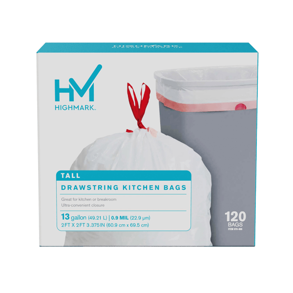 These Highmark white trash bags have a 0.9-mil thickness and come in a box of 120. The drawstring trash bags have a 13-gallon capacity for convenient closing and storage. Highmark trash bags are made …