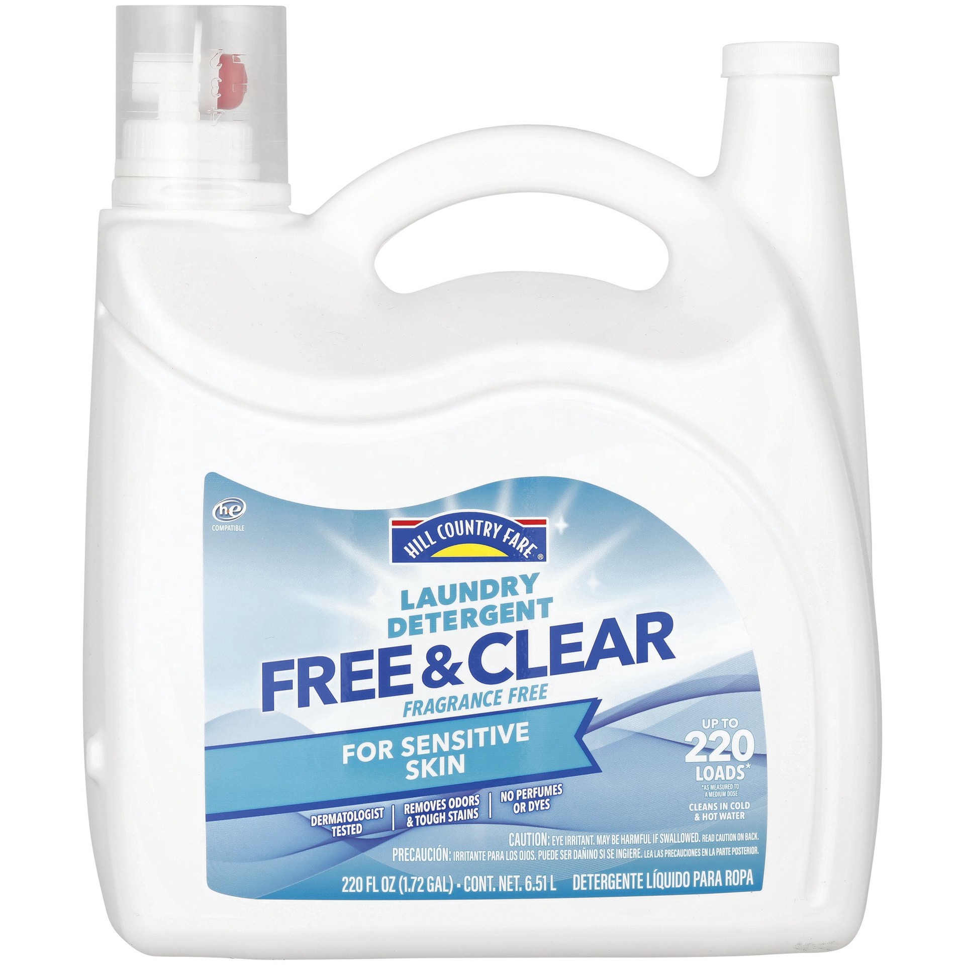 Go easy on sensitive skin by using Hill Country Fare Free & Clear liquid laundry detergent. Free of fragrances, perfumes and dyes, it's a dermatologist-tested soap for your well-loved linens and cloth…