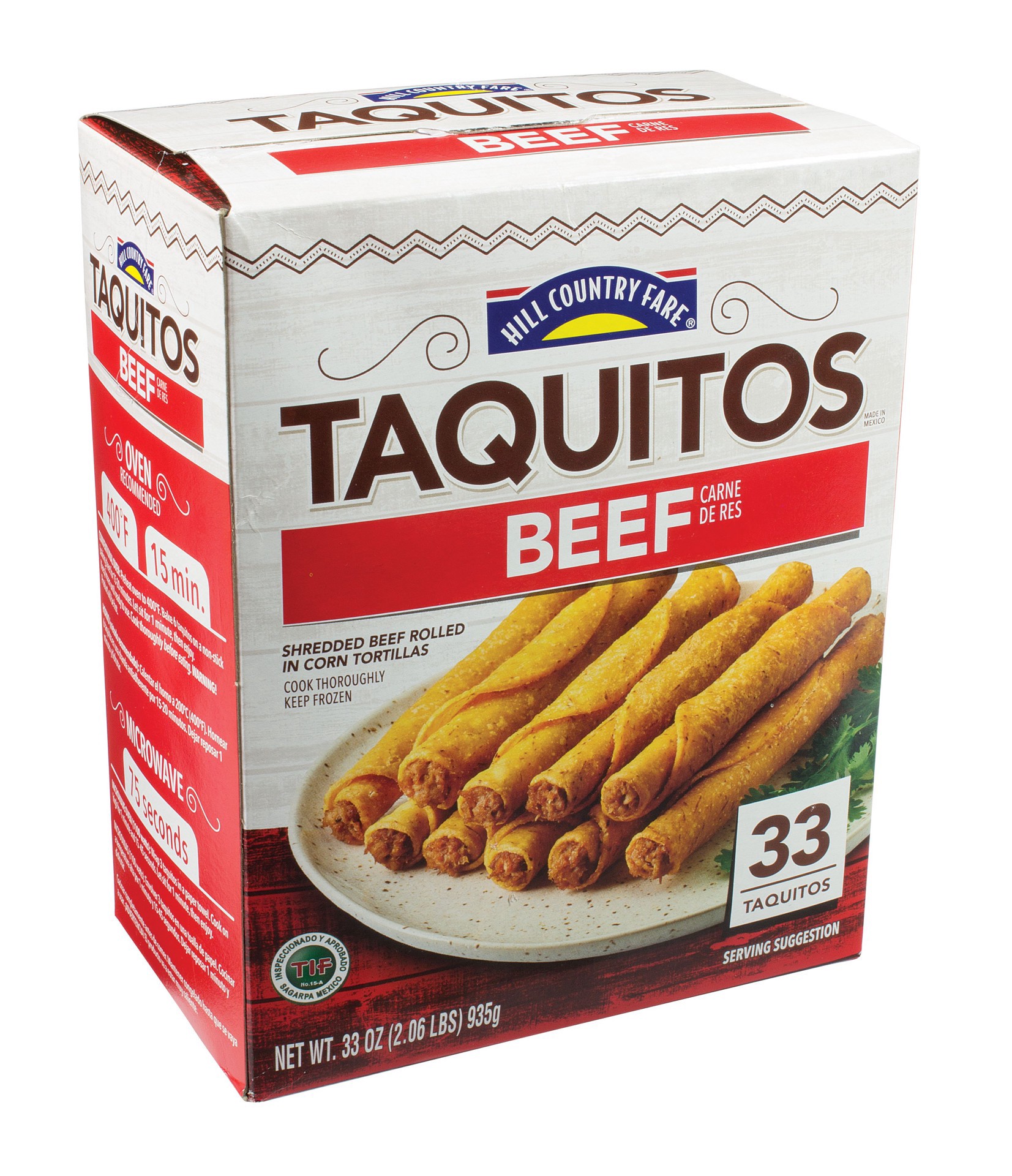 From Hill Country Fare, these frozen taquitos are made of corn tortillas that are rolled and filled with shredded beef.