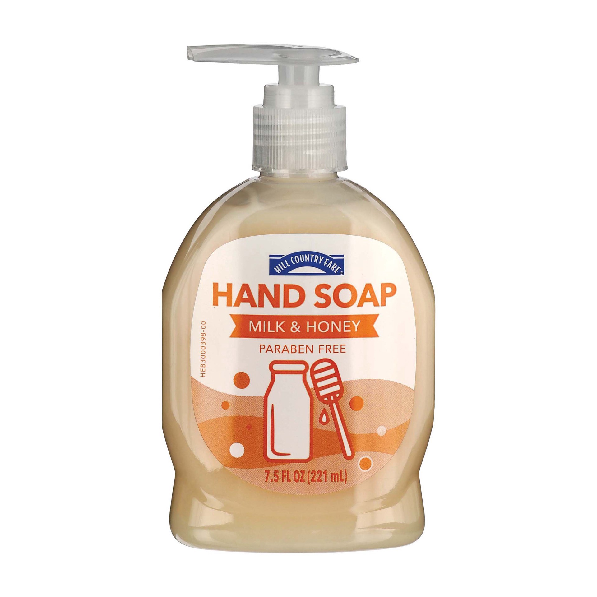 From Hill Country Fare, this hydrating hand soap with milk and honey has a paraben free formula that is gentle on skin and effectively cleans hands. • Hydrating liquid hand soap with milk and honey •…