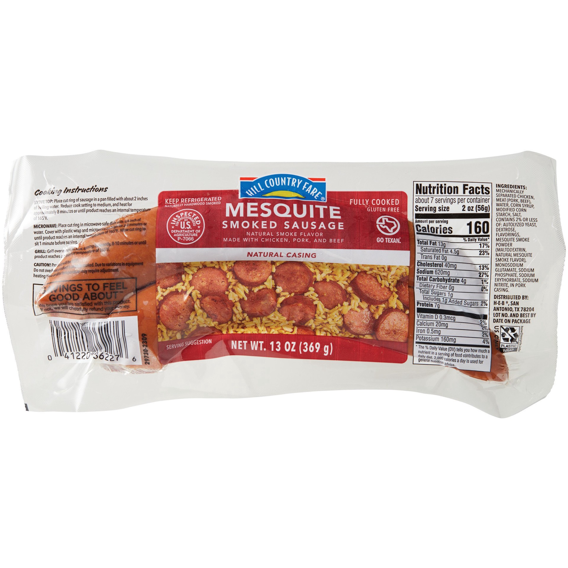 Hill Country Fare Mesquite Smoked Sausage with Natural Casing. Made with chicken, pork, and beef. Smoked flavor added.