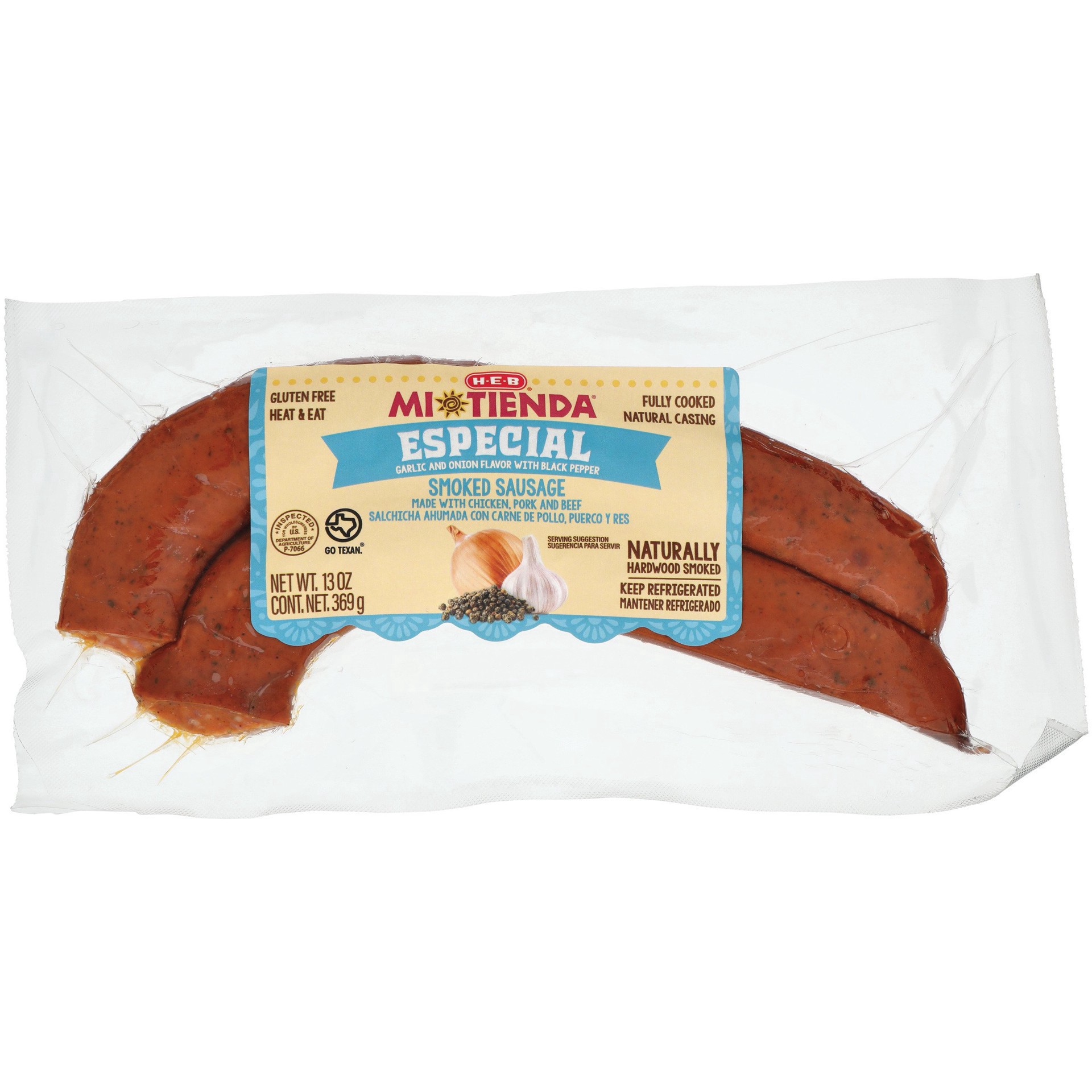 Fully cooked and easy to heat and eat, H-E-B Mi Tienda Especial smoked sausage is a savory combo of chicken, pork and beef inside a natural casing. Naturally hardwood-smoked and seasoned with black pe…