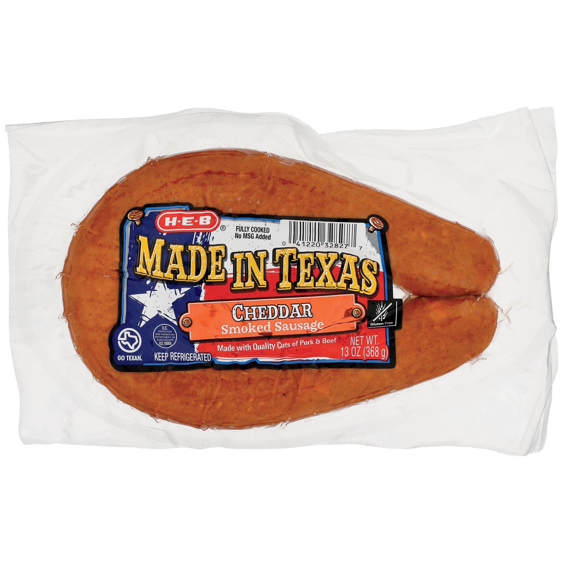 H-E-B Cheddar Cheese Smoked Sausage is made with quality cuts of pork and beef. Made in Weimar, Texas by second generation family of sausage makers. Fully cooked.