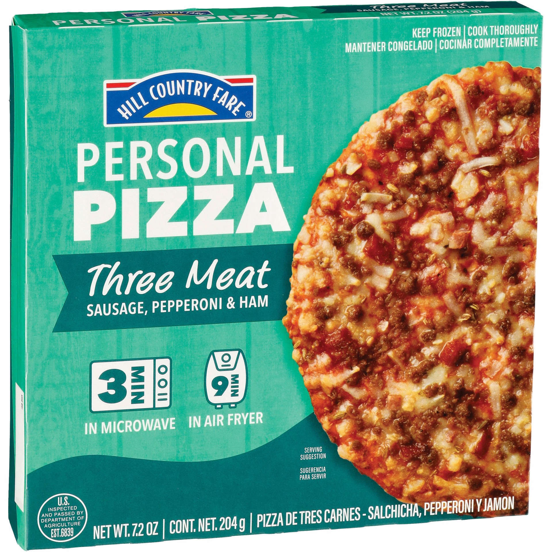From Hill Country Fare, this personal-sized frozen pizza is topped with 3 kinds of meat: sausage, pepperoni and ham. Ready in under 10 minutes when cooked in the microwave or air fryer, it can also be…