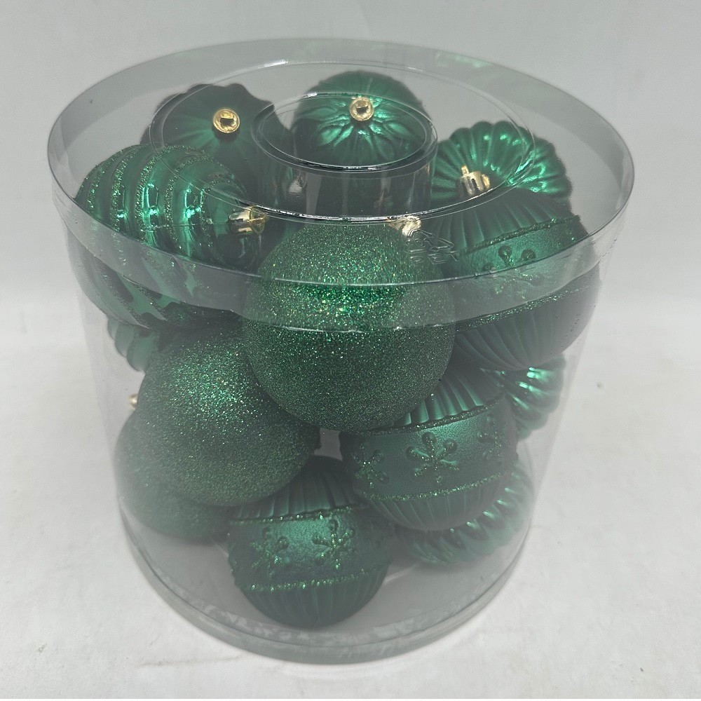 Eighteen 80 milimeter round ornaments. Dark Green with matte, glitter and shiny finishes. Shatterproof ornaments for safe and easy decorating. Easy and economical way to enhance or change decor. Can b…