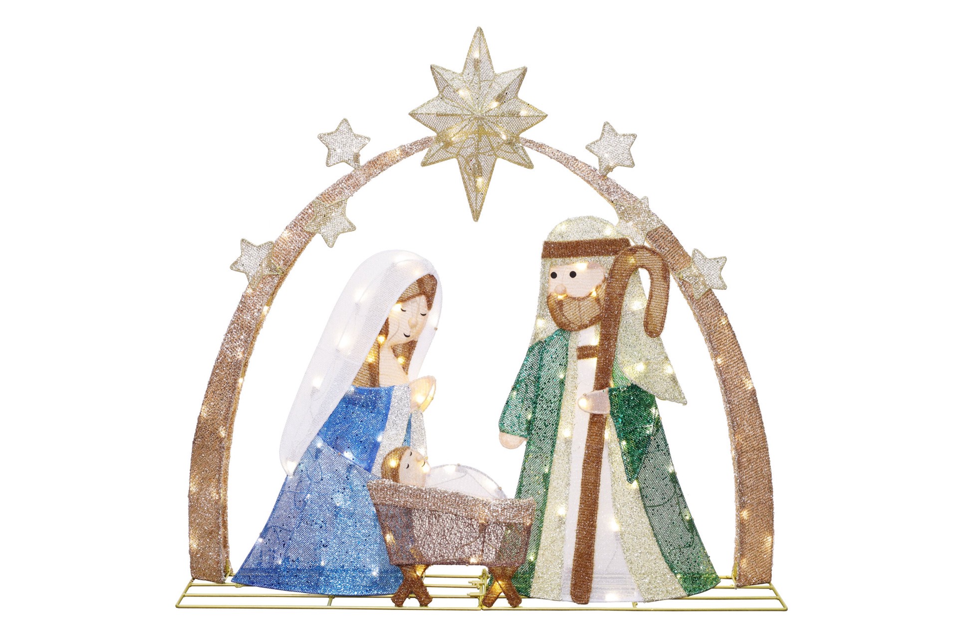3ft x 3.19ft Indoor/Outdoor Whimsical Nativity. 120 Warm White Twinkling LED Lights. Quick and easy assembly for hassle-free decorating.