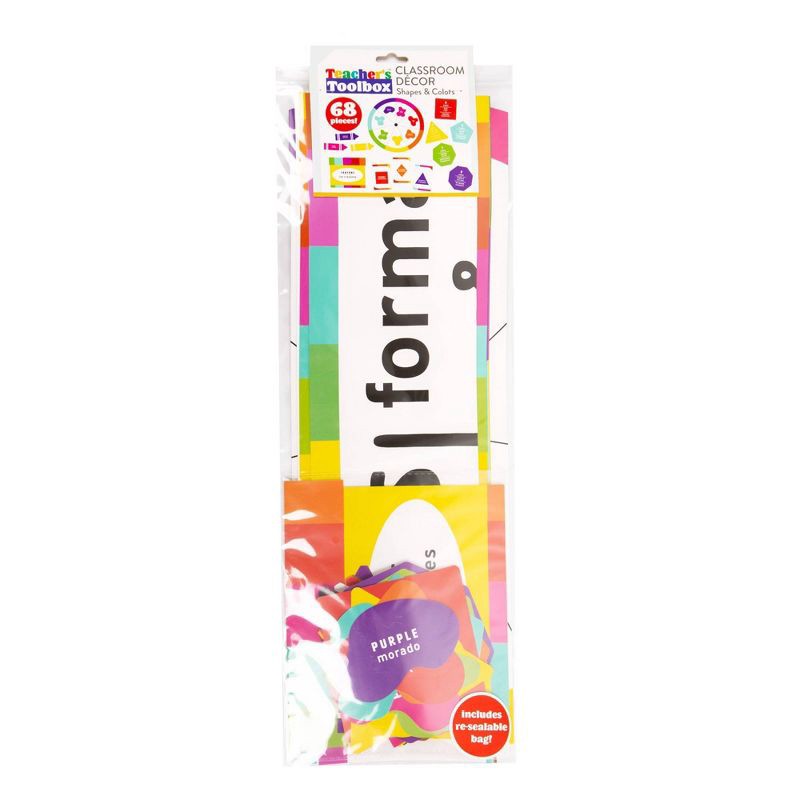 Make your classroom decorations functional with the Teacher’s Toolbox Classroom Décor Shapes and Colors pack! This 68-piece bilingual bulletin board decoration kit is a versatile learning tool that im…
