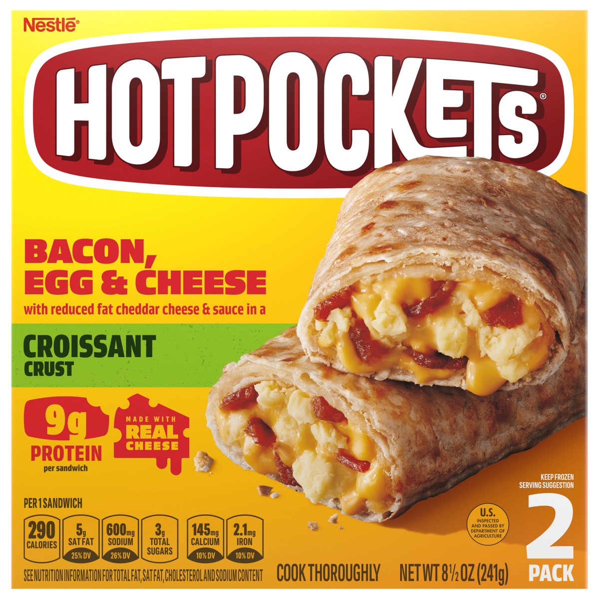 Make breakfast time anytime with Hot Pockets Applewood Bacon, Egg and Cheese Croissant Crust Frozen Breakfast Sandwiches. Each scrumptious microwave sandwich is loaded with eggs, applewood bacon and r…