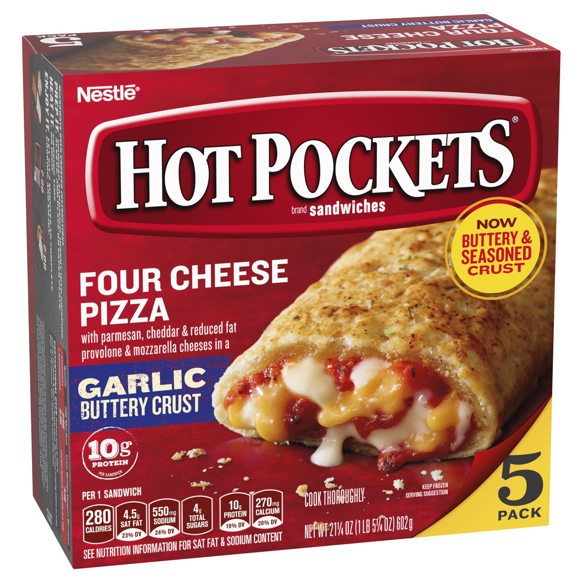 Hot Pockets Four Cheese Pizza Garlic Buttery Crust Frozen Snacks offer an ideal choice for a quick lunch or easy dinner. These pizza Hot Pockets are made with Parmesan\, cheddar and reduced fat provol…