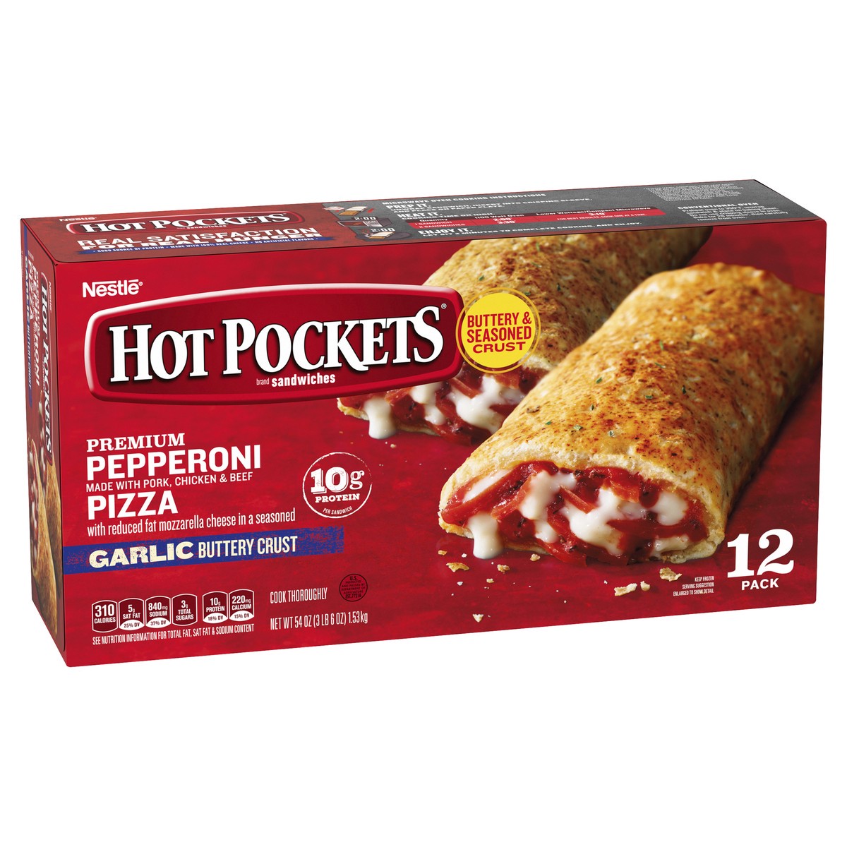 Hot Pockets Pepperoni Pizza Frozen Sandwiches are a quick and easy solution for lunch or dinner. Hot Pocket Pepperoni Pizza sandwiches are made with pepperoni and 100% real reduced fat mozzarella chee…