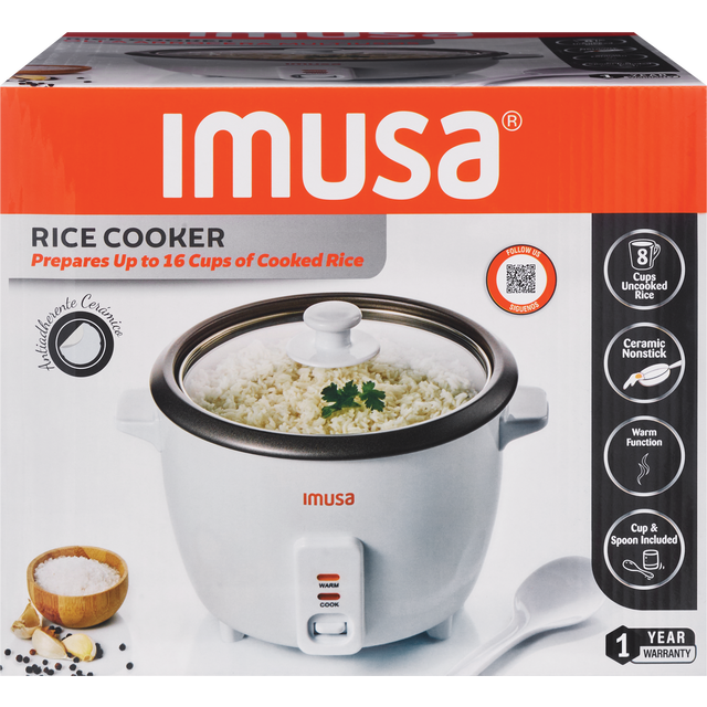The IMUSA 8 Cup Electric Rice Cooker will make the perfect rice dish at the flip of a switch. Ceramic non-stick coating for effortless food release and healthier cooking“ Includes, serving spoon and m…