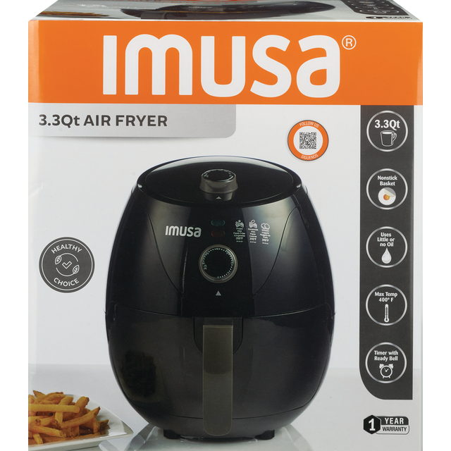 IDEAL FOR AIR FRYING, BAKING, GRILLING, ROASTING, AND REHEATING. 3.3 Qt, Nonstick Basket, Uses Little or no Oil, Max Temperature 400F. Timer with ready Bell.