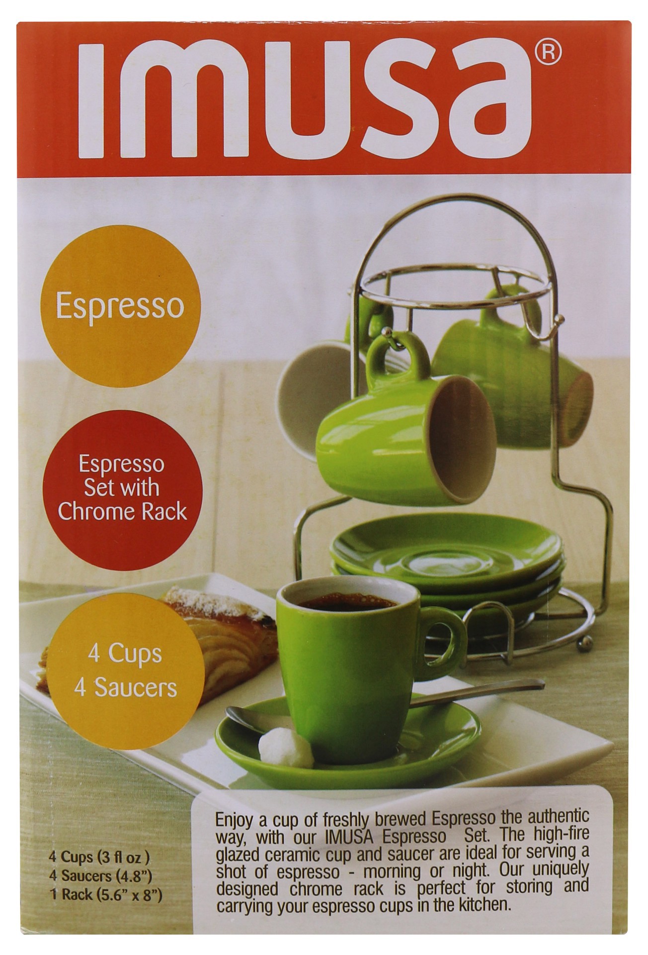 slide 1 of 1, Imusa Espresso Green Color Cups & Saucer Set With Chrome Rack, 9 pc