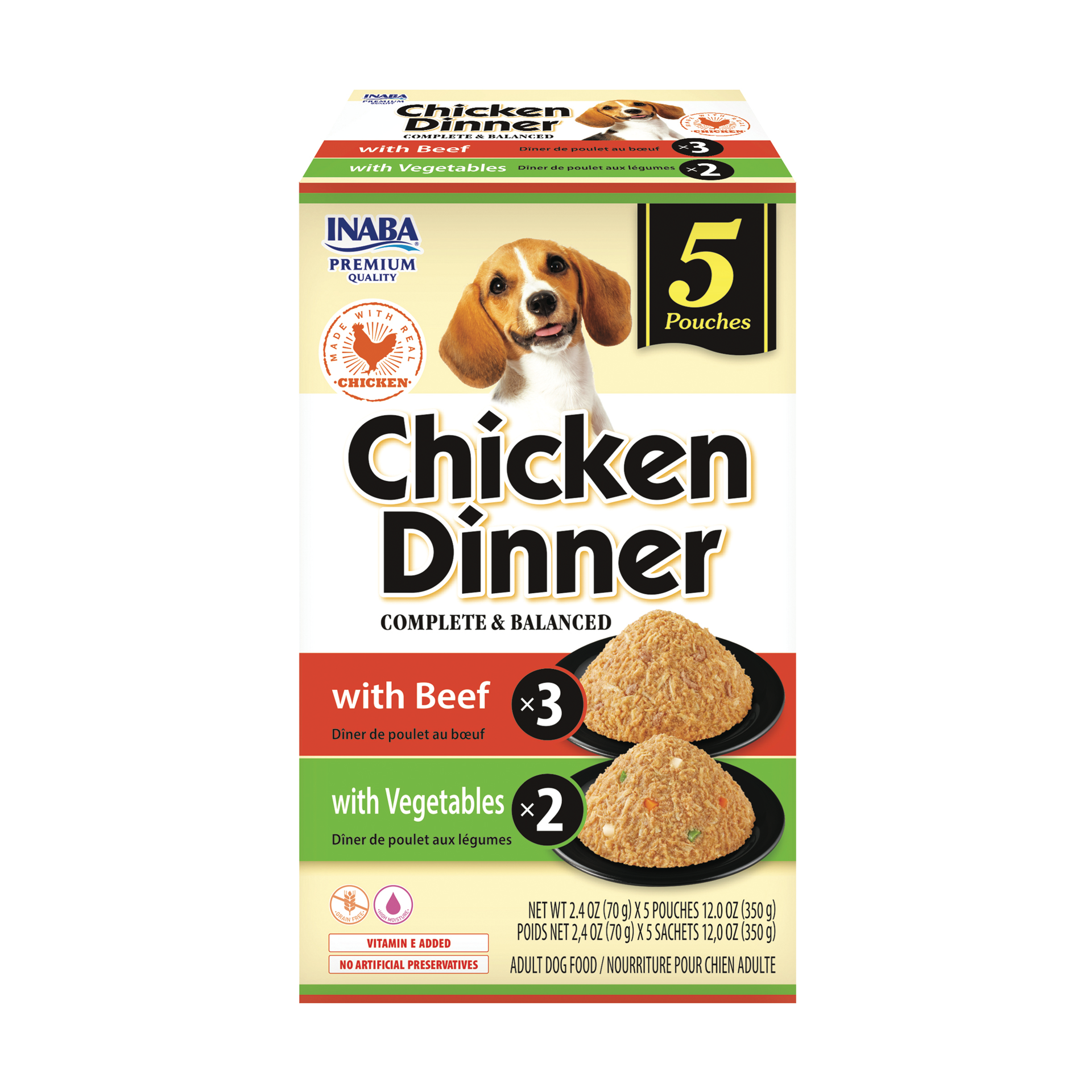 Inaba Chicken Dinner For Dog, Complete & Balanced, Soft, Smooth Pâté Dog Food, 2.4 oz. Pouch, 5 Pouches, Beef & Vegetables Variety