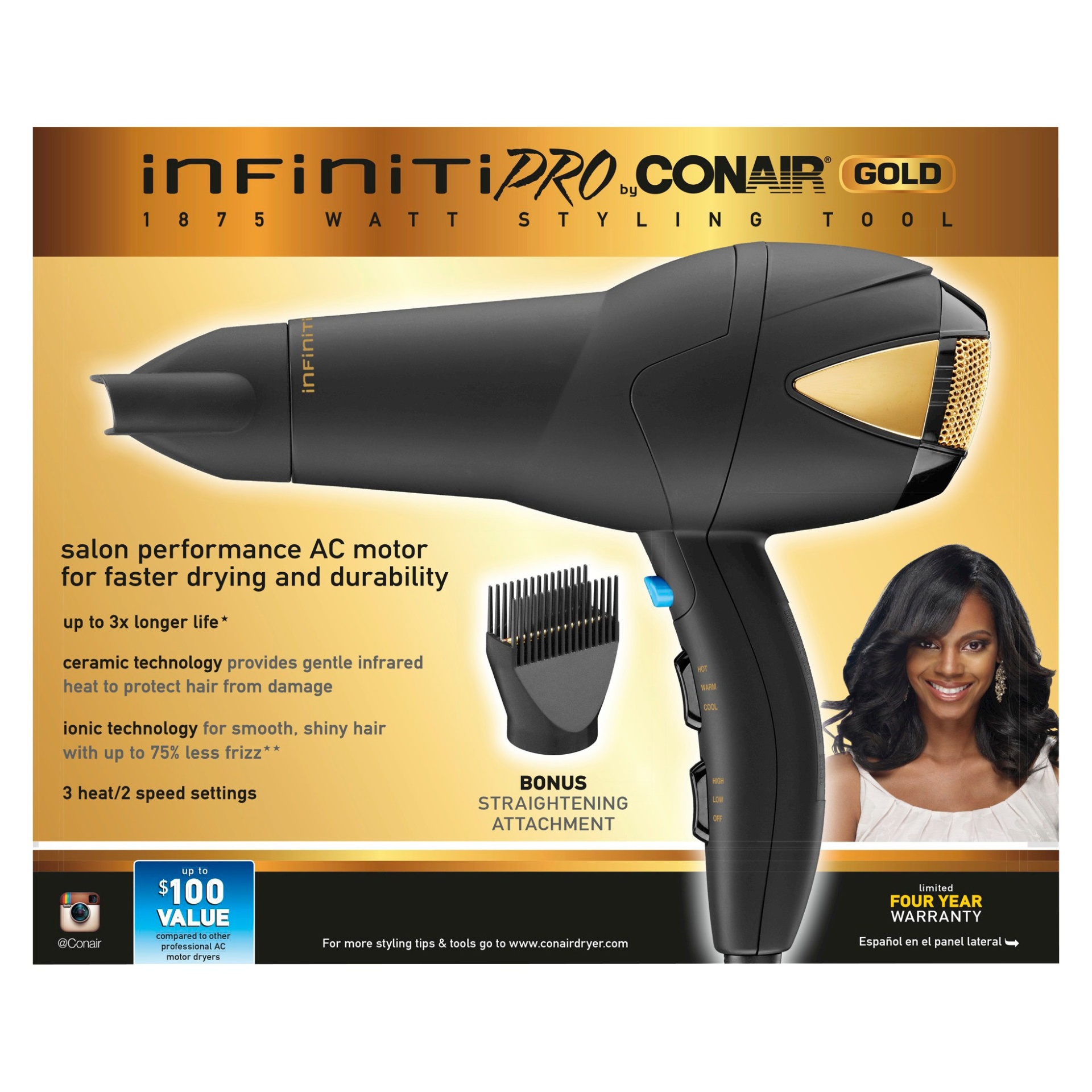 The Infiniti Pro Gold by Conair 1875 Watt Styling Dryer is designed with a salon performance AC motor that delivers powerful airflow for up to 50% faster drying and up to 3x longer life. Ceramic techn…