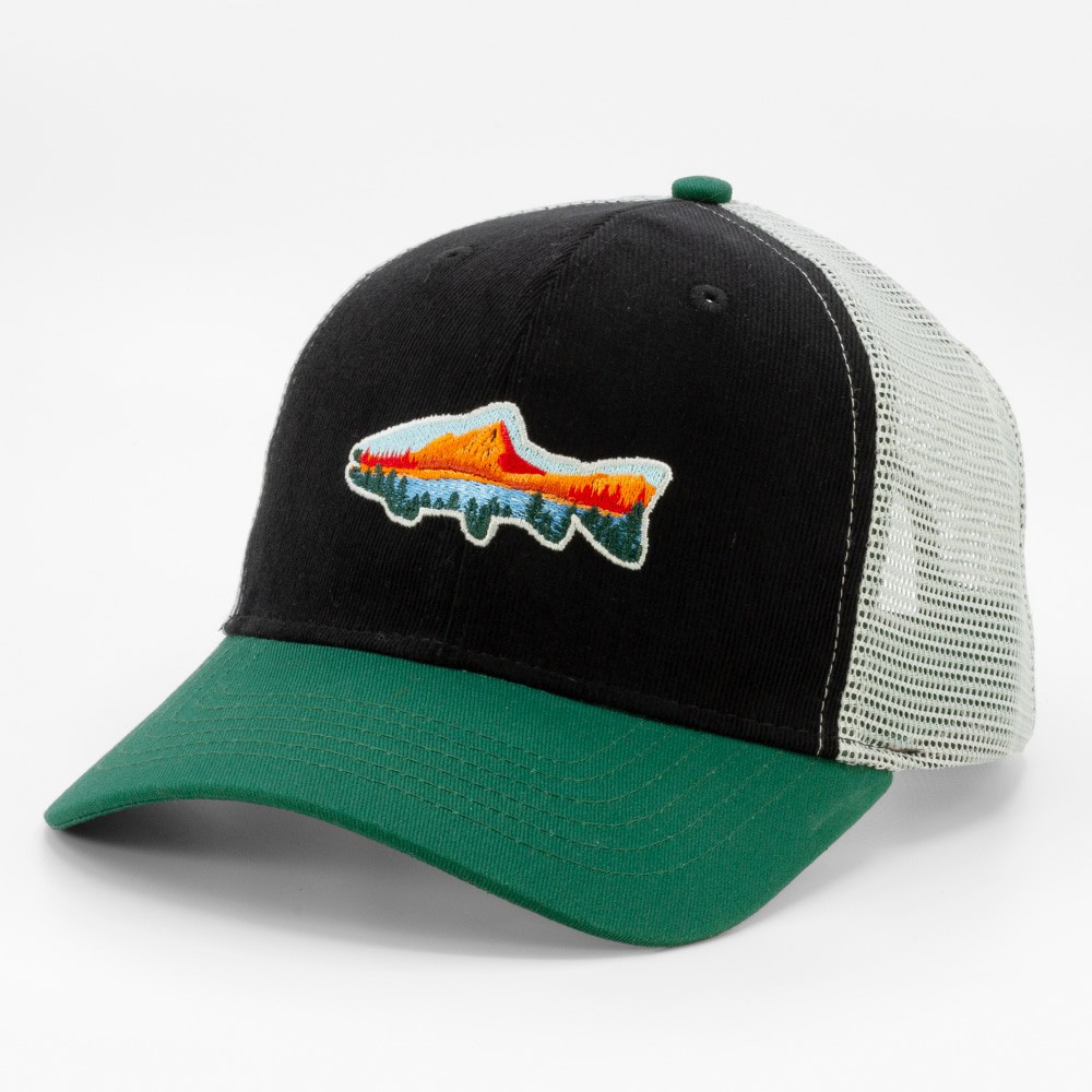 This structured mesh-back trucker cap features a striking trout-shaped design filled with a vibrant landscape graphic.. Made with cotton corduroy and polyester mesh, this cap is perfect to throw on fo…