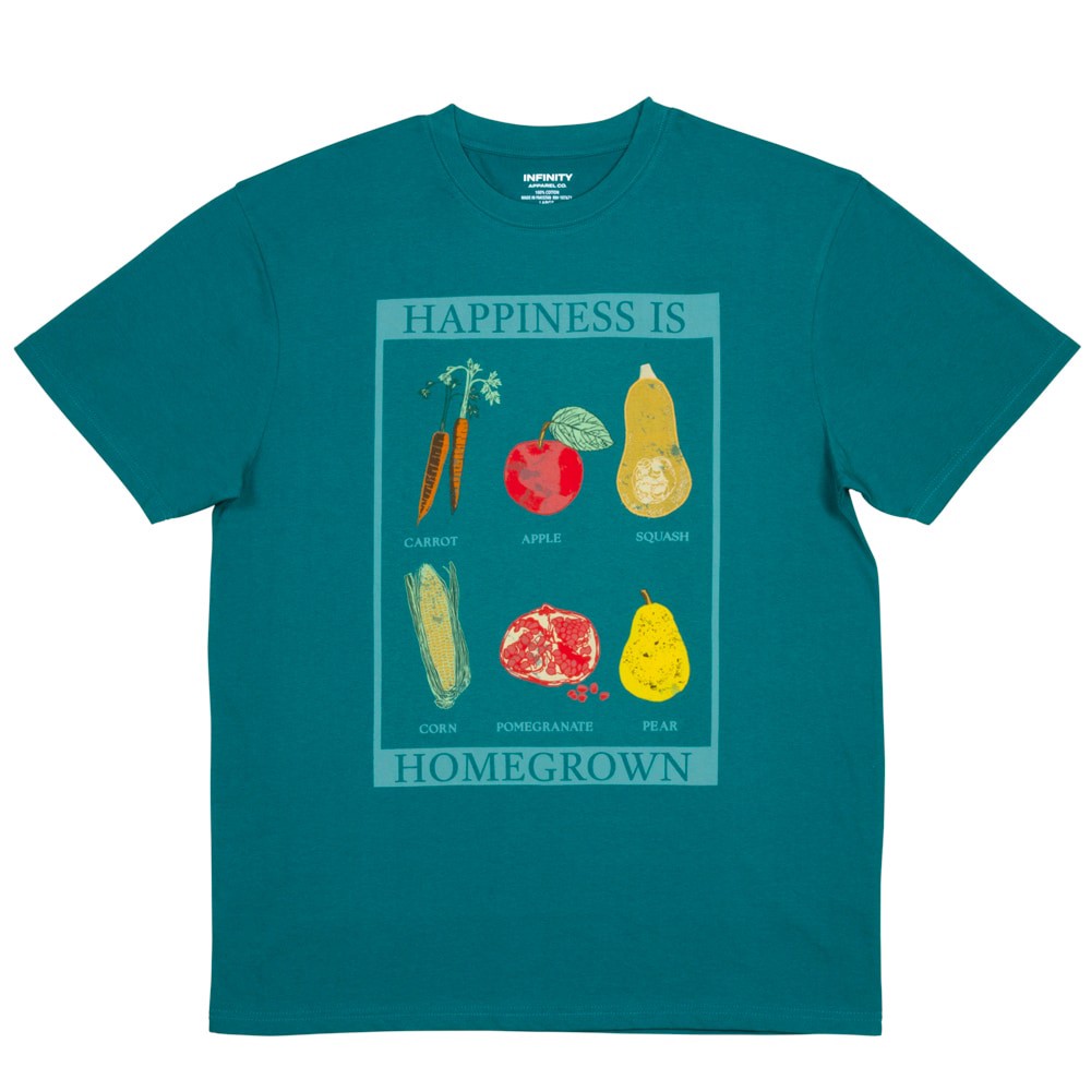 This T-shirt speaks volumes with its message, "Happiness is Homegrown," perfectly paired with colorful fruits and veggies.. Made with 100% cotton, this T-shirt is soft, comfortable, and will be your n…
