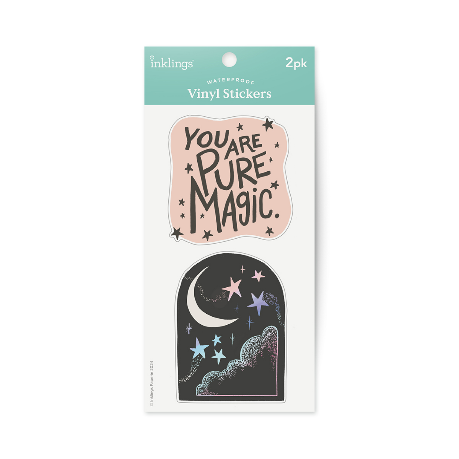 This set of two waterproof and dishwasher-safe vinyl stickers are perfect for decorating water bottles, travel mugs, tech cases, laptops, and more. Peel and stick to any smooth, hard surface.
