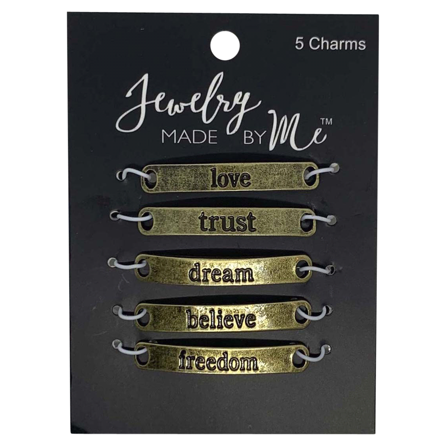 Use these inspirational connector charms in your next DIY project. Each charm is in antique gold, there are five different charms. Each one is in smooth antique gold and is in a long bar shape with ro…