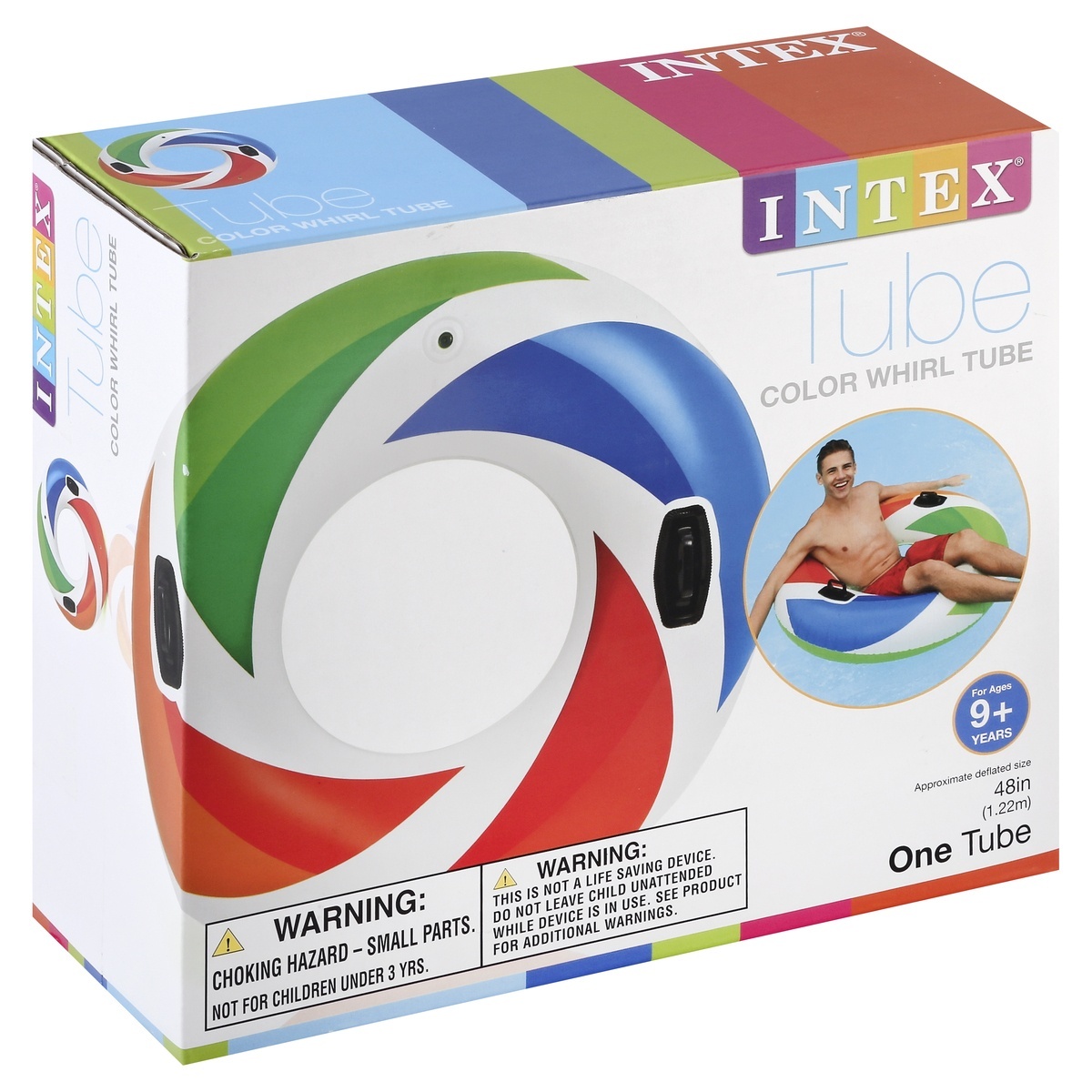 For ages 9+ years. Approximate deflated size: 48 in (1.22 m). A whirling rainbow of fun! Durable handles. 2 air chambers for added safety. Repair patch. Visit Intex at: www.intexcorp.com. Made in Chin…