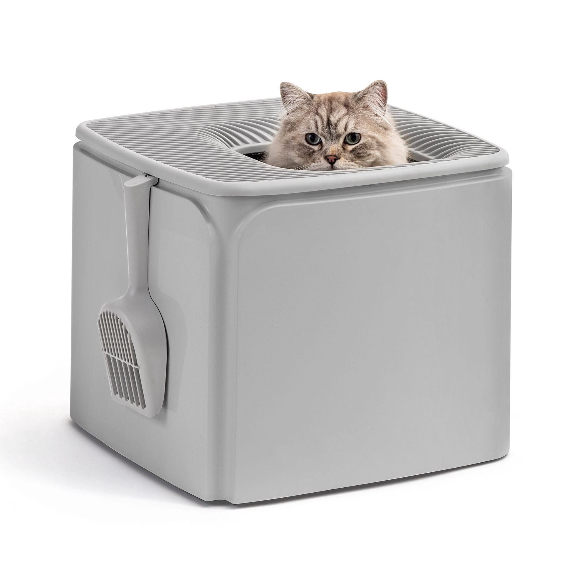 Iris, Premium Top Entry Cat Litter Box With Scoop - Enclosed Square Design, Gray
