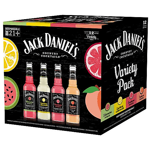 A refreshing fruit flavor variety pack featuring Jack Daniels Country Cocktails most popular flavors Watermelon Punch, Lynchburg Lemonade, Downhome Punch, and Southern Peach.