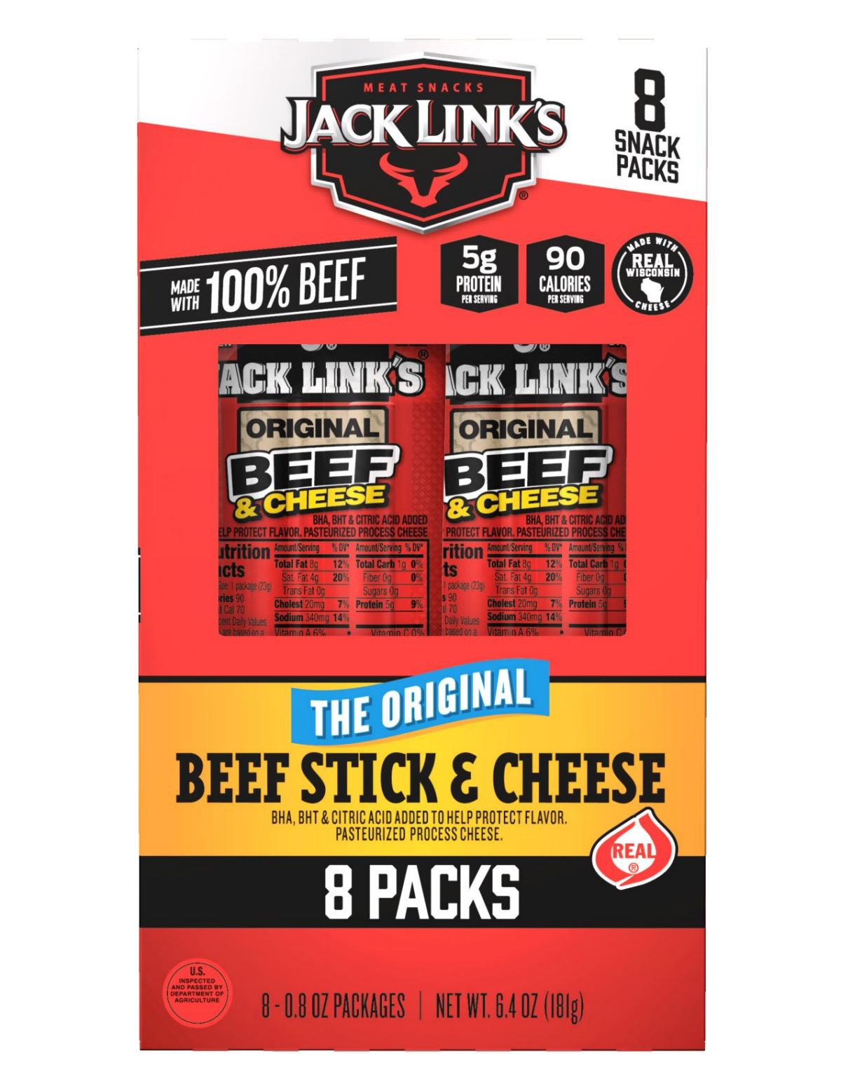 BEEF STICK: BEEF, WATER, SALT, CORN SYRUP, CONTAINS 2% OR LESS OF FLAVORS, DEXTROSE, SUGAR, SODIUM ERYTHORBATE, LACTIC ACID STARTER CULTURE, CITRIC ACID, SODIUM NITRITE, BHA, BHT, CASING (CARAMEL, RED…