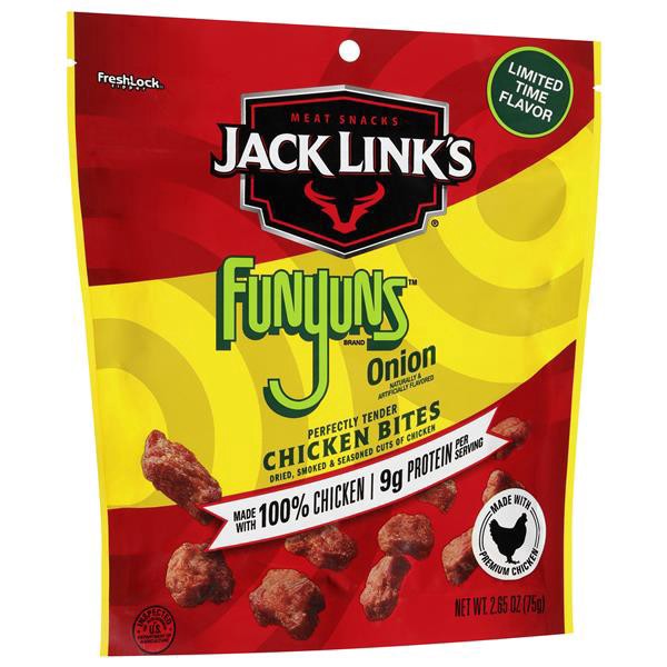 Limited Time Flavor Dried, smoked & seasoned cuts of chicken Naturally & artificially flavored 9 g protein per serving Limited time flavor Meat snacks Meat your flavor Two legendary brands one epic sn…