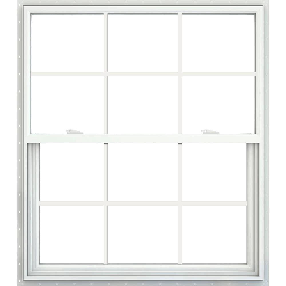 JELD-WEN V-2500 31-1/2-in x 35-1/2-in White Exterior Vinyl New Construction Single Hung Window Low-E Double Pane Glass with Grids, (Half Screen Included)