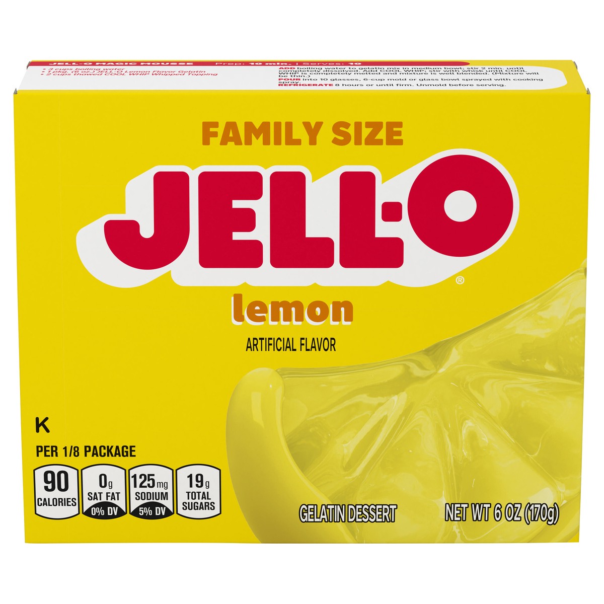 Snack happy. Jell-O Lemon Artificially Flavored Gelatin Dessert Mix lets you add some wonder to your day with a delicious snack. Spoon up a smile with our artificially flavored lemon Jell-O gelatin th…