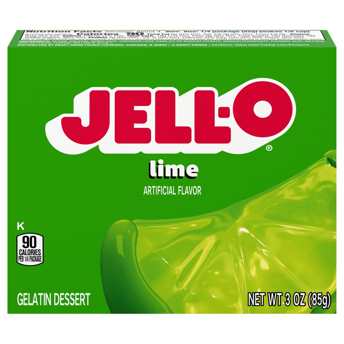 Snack happy. Jell-O Lime Artificially Flavored Gelatin Dessert Mix lets you add some wonder to your day with a delicious snack. Spoon up a smile with our artificially flavored lime Jell-O gelatin that…