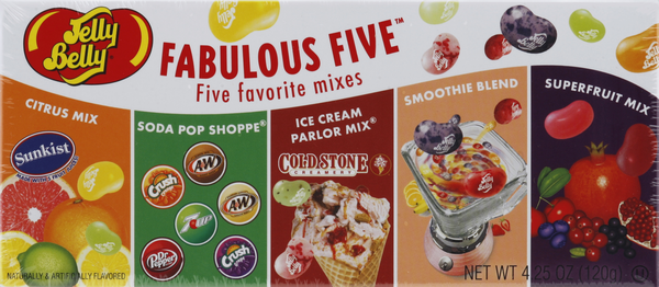 Sunkist citrus mix; Soda Pop Shoppe; Cold Stone Creamery ice cream parlor mix; Smoothie blend; Superfruit mix. Naturally & artificially flavored. The original gourmet jelly bean. Fiver flavorlicious J…
