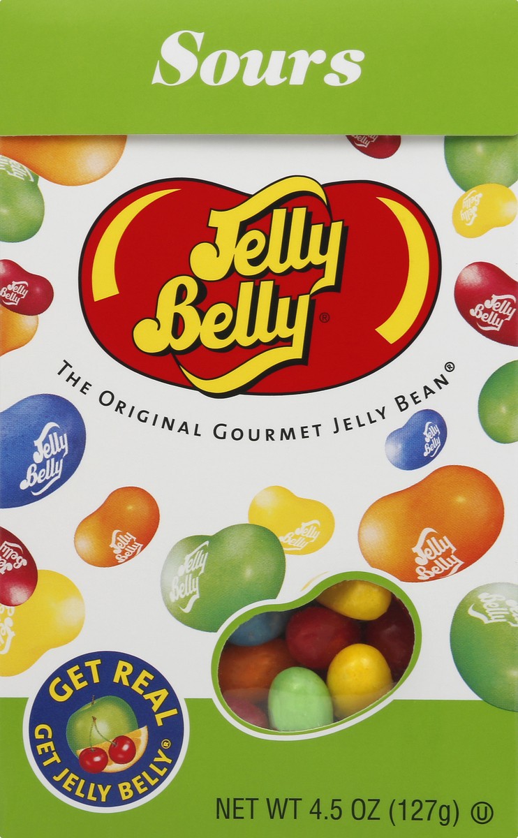 The original gourmet jelly bean. Get real. Get Jelly Belly. A fat free food. Gluten free. Peanut free. 4 calories per bean. 4 calories per bean. Sour apple; sour cherry; sour grape; sour lemon; sour o…