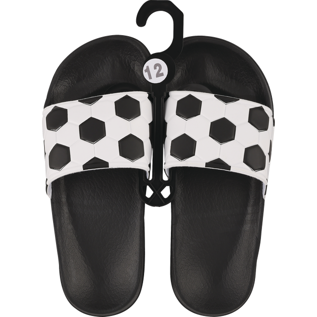 For your little soccer fans. Black and white soccer ball slide sandal. Available in assorted sizes.