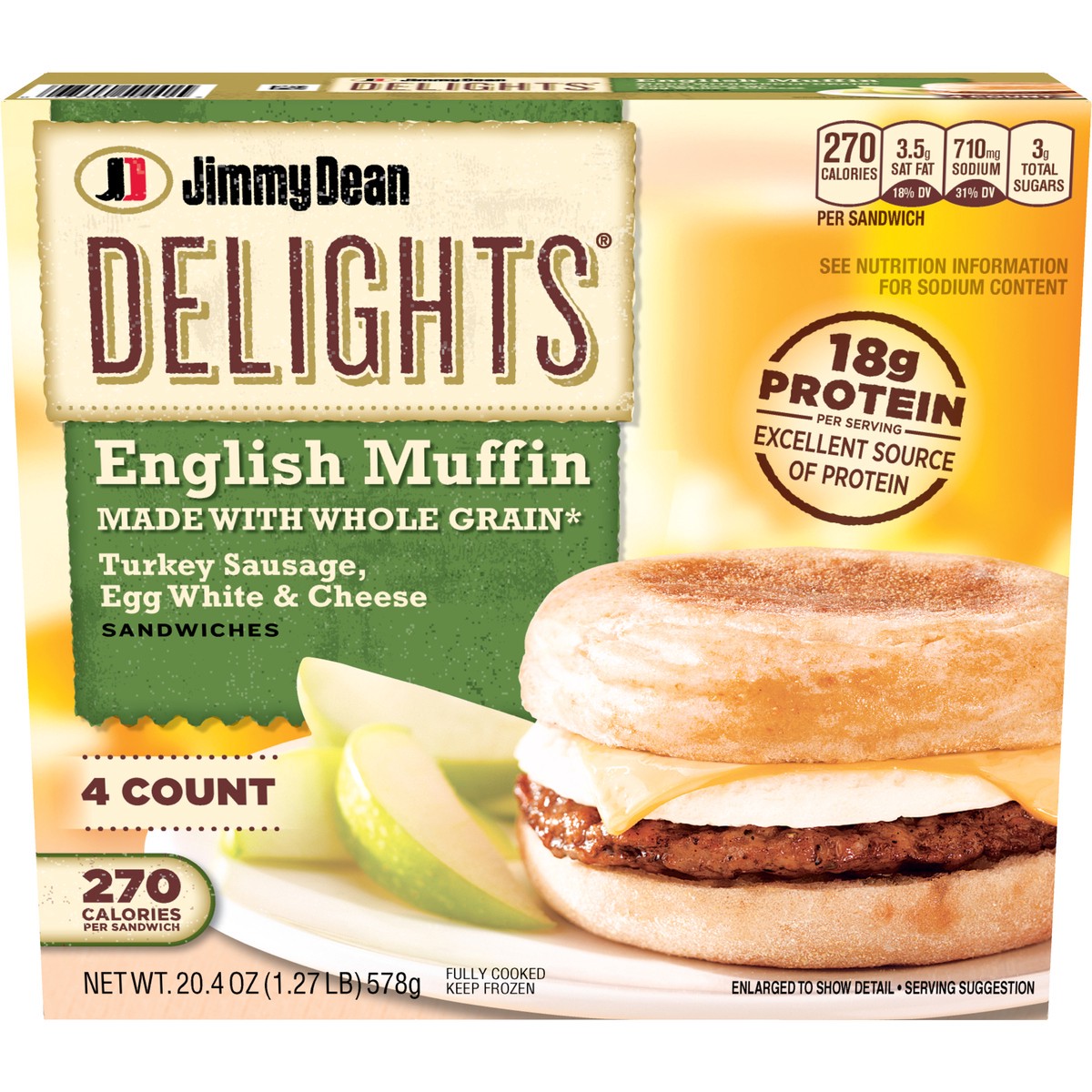 Help give more power to your mornings with Jimmy Dean Delights Turkey Sausage\, Egg White & Cheese English Muffin Breakfast Sandwiches. Turkey sausage\, egg whites and cheese come together on a whole …