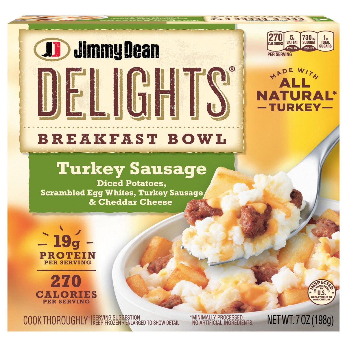 Jimmy Dean Delights Turkey Sausage Breakfast Bowl has all of your breakfast favorites. This microwavable breakfast is filled with turkey sausage, eggs, diced potatoes and cheese. With 18 grams of prot…