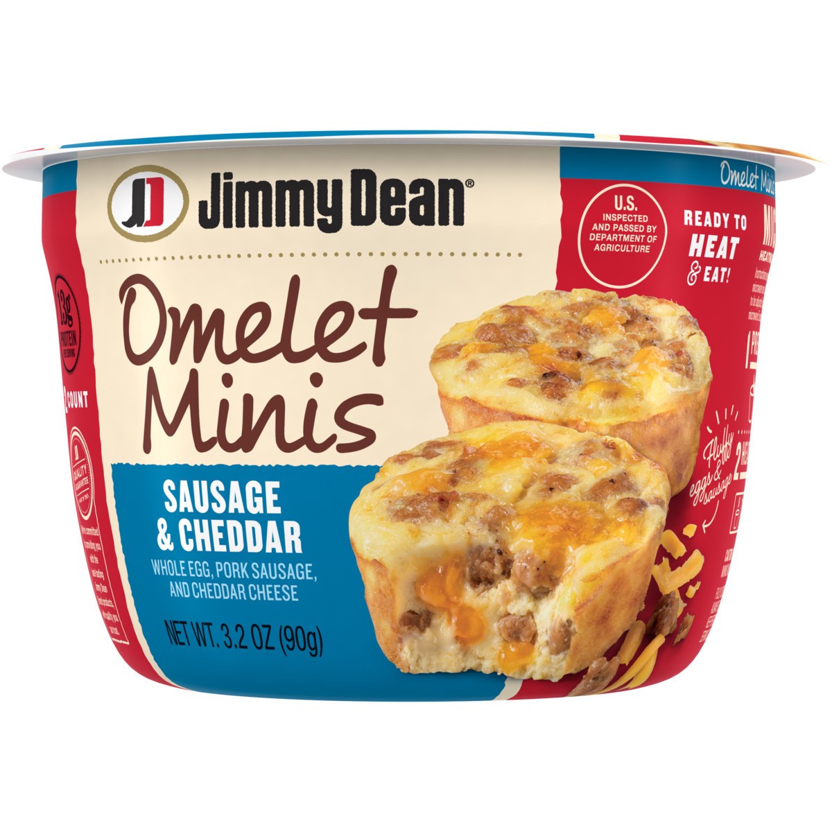 Give more power to your mornings with Jimmy Dean Sausage & Cheddar Omelet Minis. Featuring fluffy eggs\, pork sausage and cheddar cheese blended together for a delicious breakfast that is ready to hea…