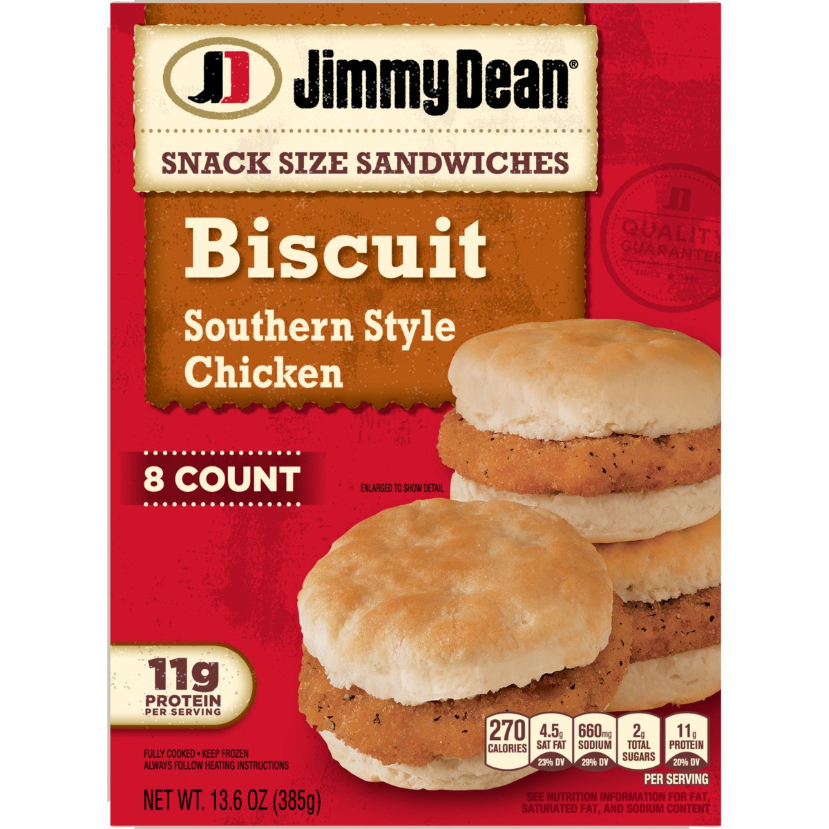 Enjoy breakfast any time of day with Jimmy Dean Frozen Snack Size Southern-Style Chicken Biscuit Sandwiches. Featuring crispy fried chicken patties on mini golden baked biscuits, our snack size sandwi…