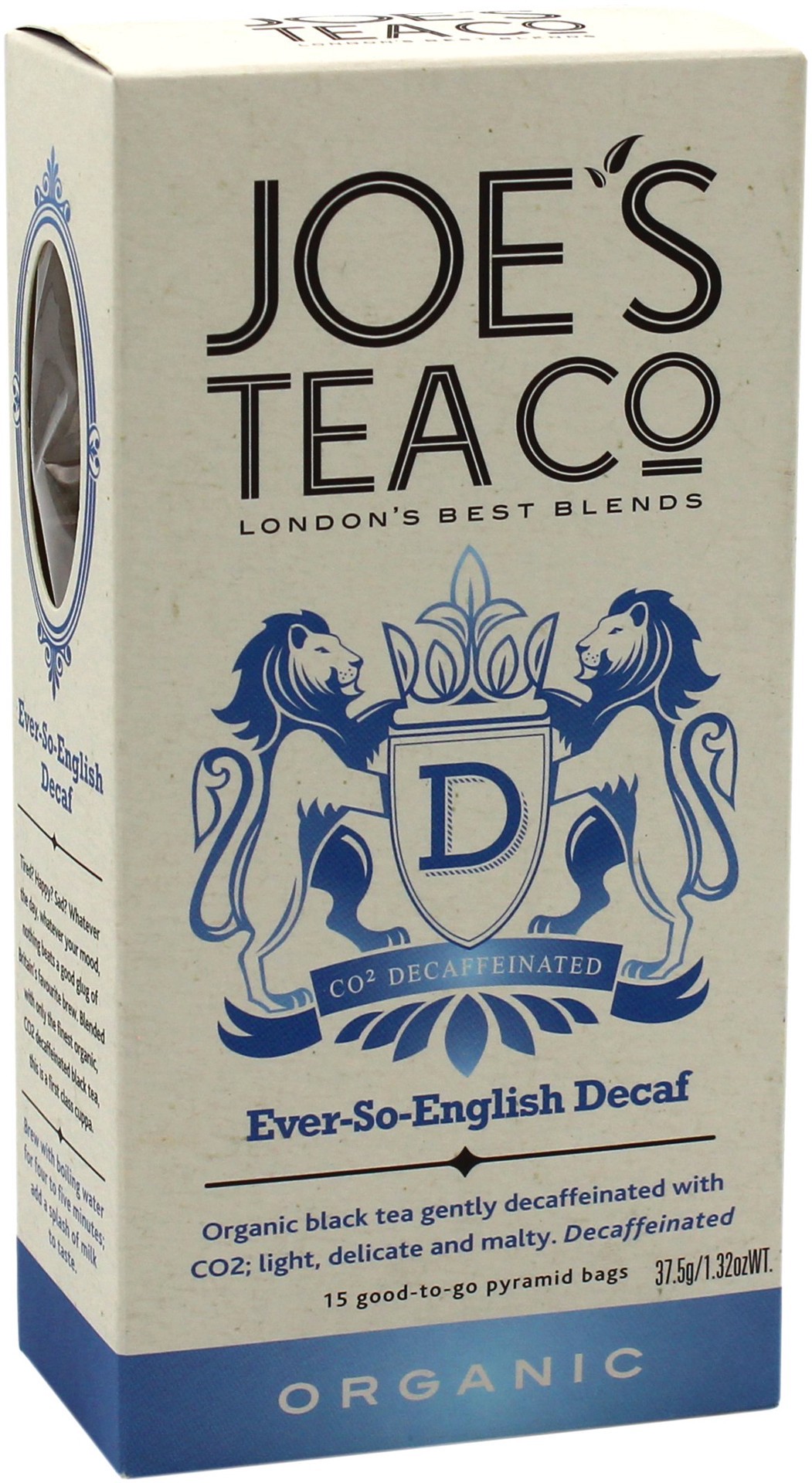 Joe's Tea Co. Ever-So-English Decaf Tea. Organic black tea gently decaffeinated with CO2; light, delicate and malty. Joe's Tea Co gently decaffeinates these tea leaves with CO2, rather than nasty chem…