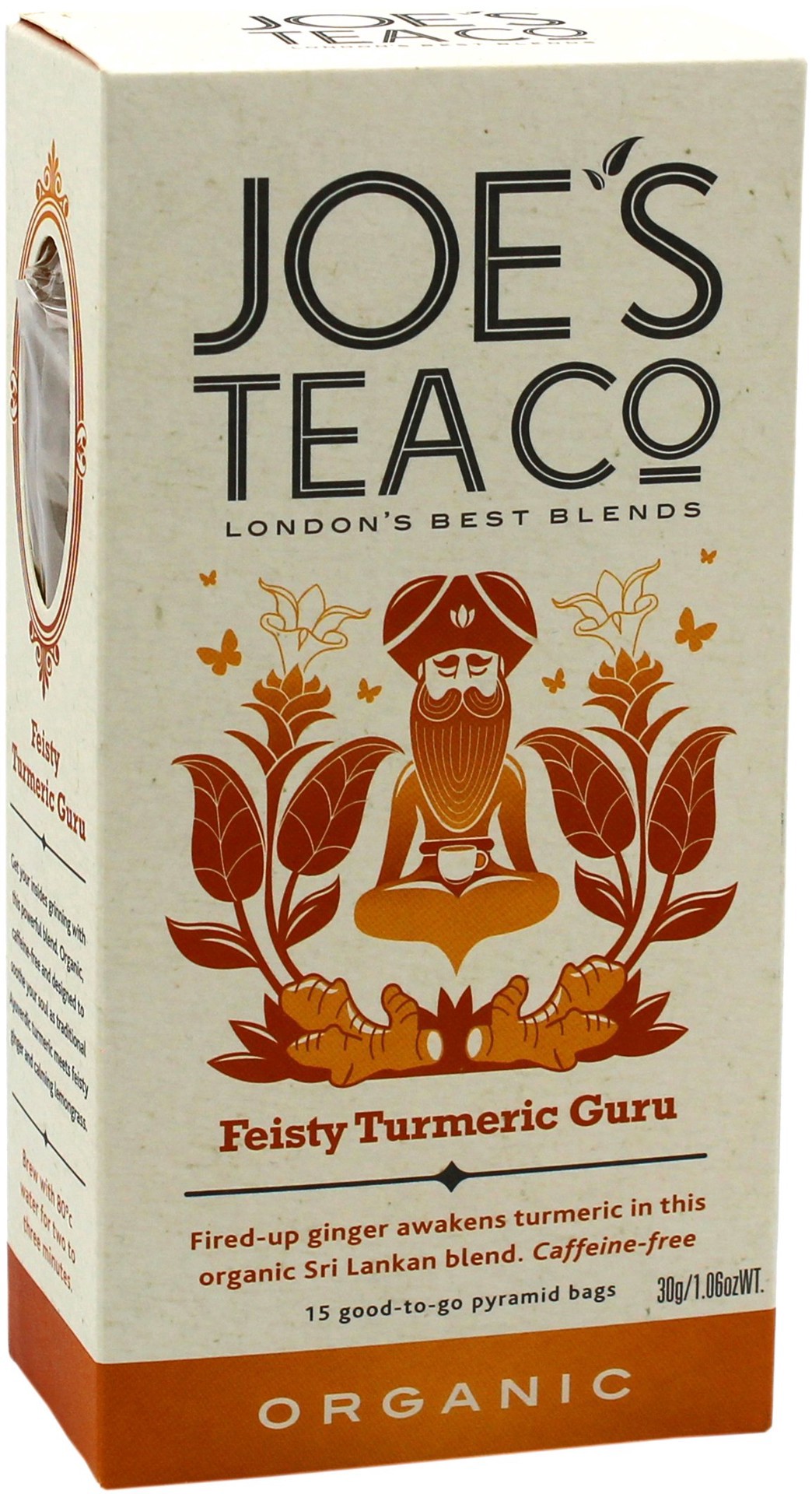 Joe's Tea Co. Organic Feisty Turmeric Guru Tea. Get your insides grinning with this powerful blend. Organic, caffeine-free and designed to soothe your soul as traditional Ayuverdic turmeric meets feis…