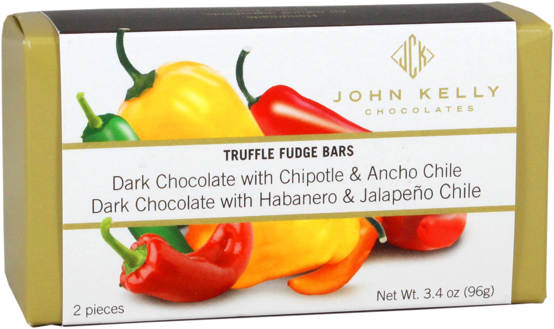 John Kelly's spicy chile and chocolate flavors combine the right amount of heat with our special dark chocolate truffle fudge. This box has one bar of habanero and jalapeño, and one bar of chipotle an…