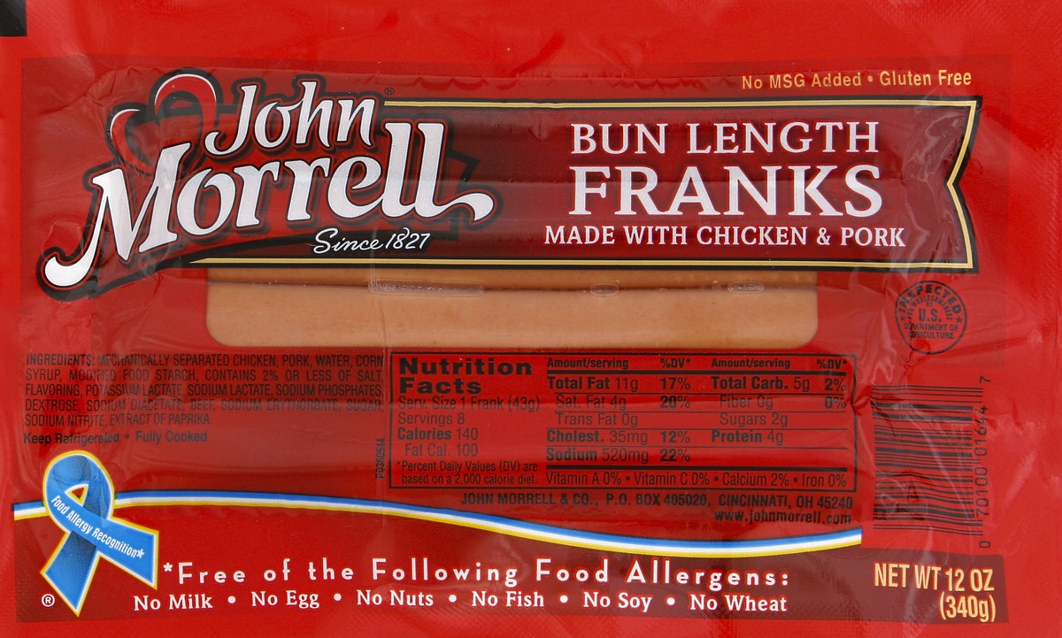 Mechanically Separated Chicken, Pork, Water, Corn Syrup, Modified Food Starch, Contains 2% or Less of Salt, Flavoring, Potassium Lactate, Sodium Lactate, Sodium Phosphates, Dextrose, Sodium Diacetate,…