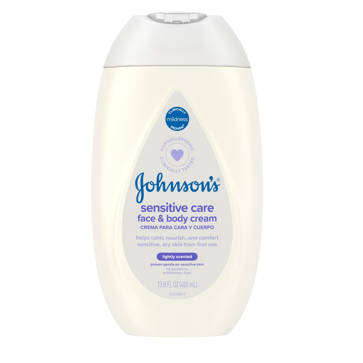 Calm\, nourish\, and comfort your baby's dry\, sensitive skin with Johnson's Sensitive Care Face and Body Cream for Babies. This gentle\, hypoallergenic daily baby body and face cream has a soothing\,…