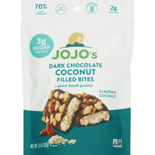 JOJO's Dark Chocolate Bites Coconut Creme Filled + plant based protein. 70% dark chocolate